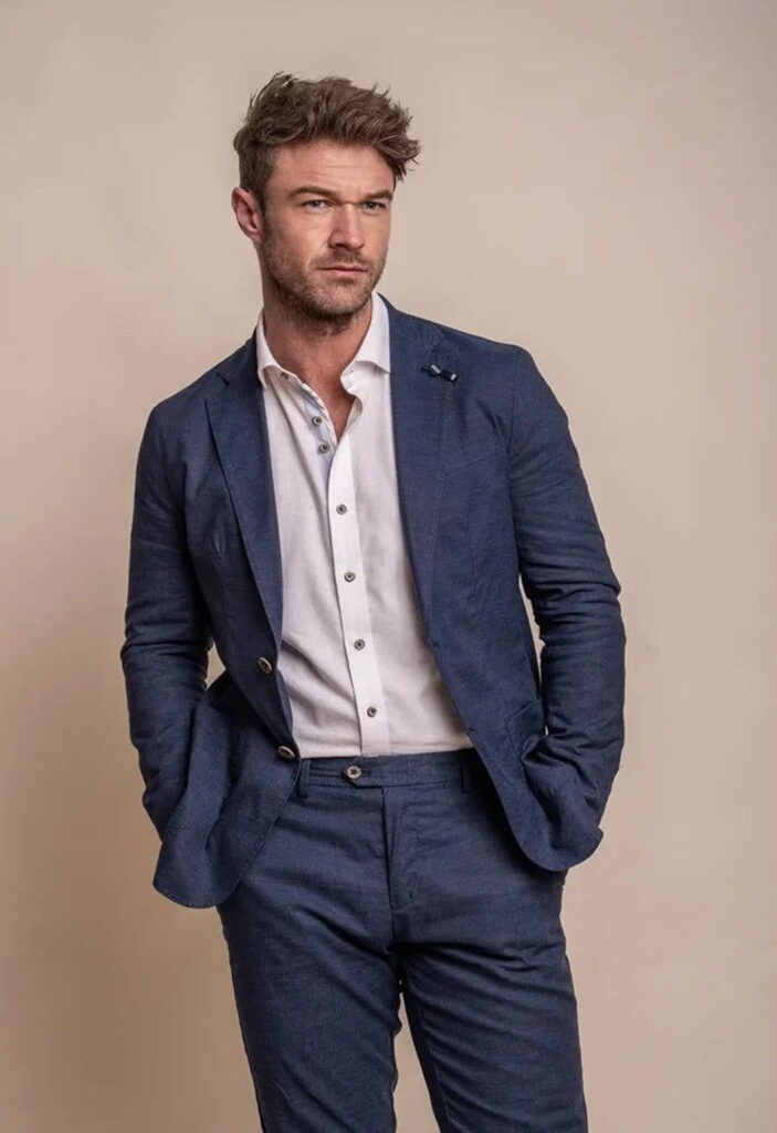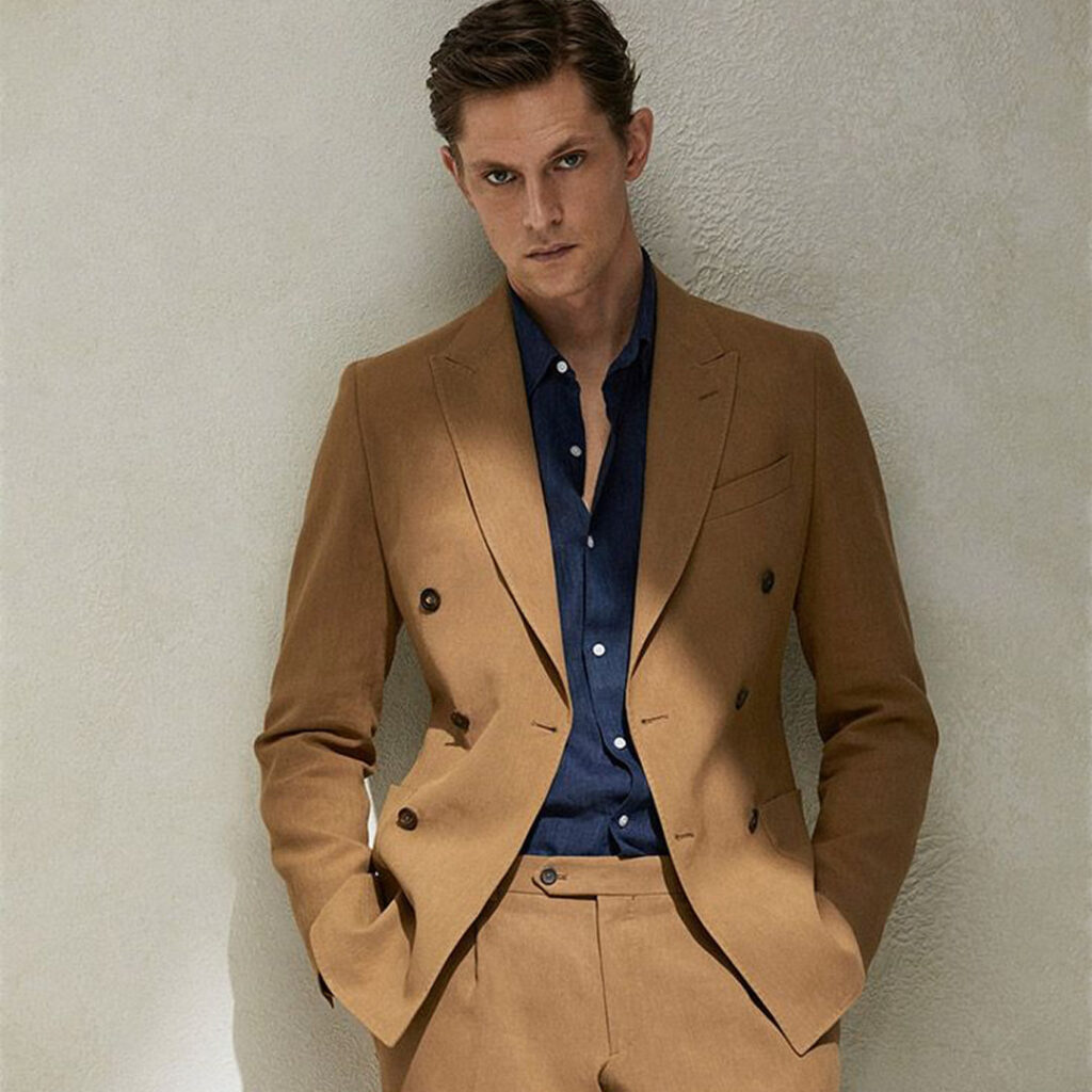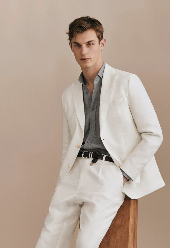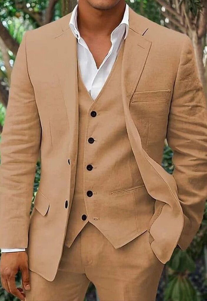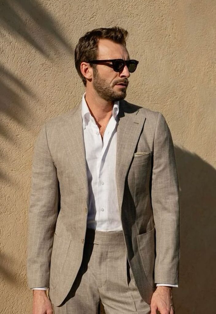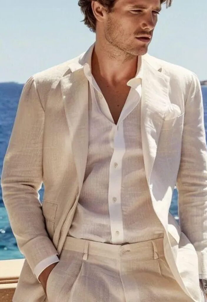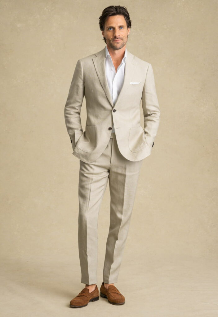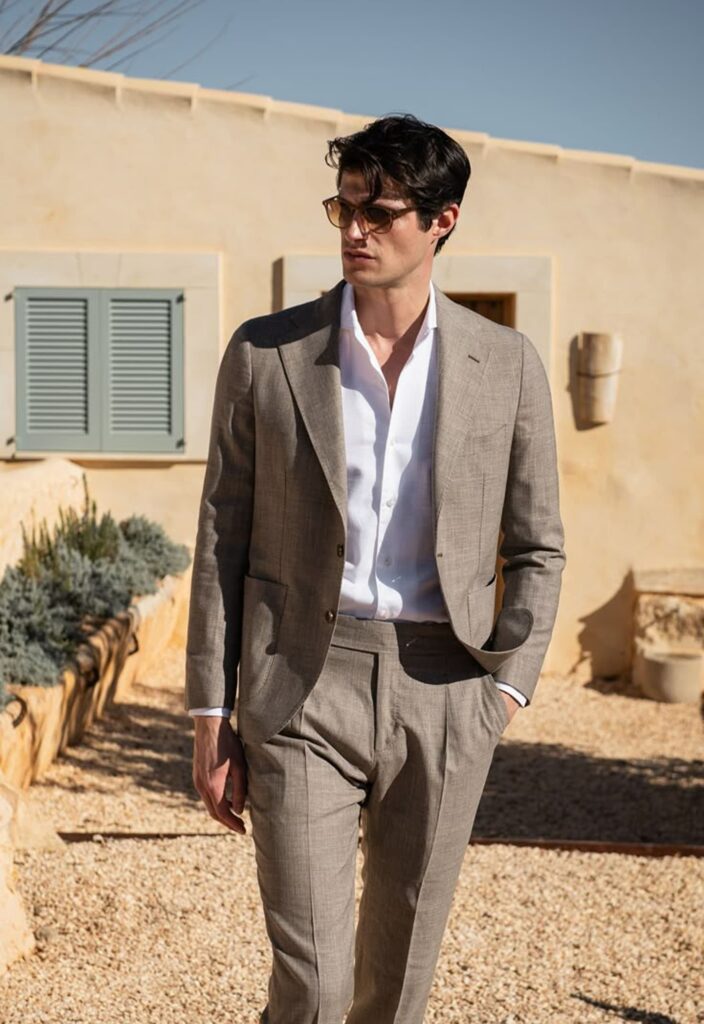 Lightweight wool, linen, and breathable blends work best, helping regulate temperature while keeping the suit structured, comfortable, and presentable throughout the day.